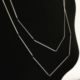 Sleek and sculptural, the Geo Silver Jewel Necklace brings a modern edge to timeless elegance. Handcrafted with fine round rods of Sterling Silver (925) in varying lengths, this design plays with shape and structure - softened by glints of colourful Swarovski crystals in jewel tones.