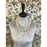 A bold interpretation of timeless elegance, this statement necklace features intricately handcrafted lace-like clusters of luminous freshwater pearls, delicately accented with matte onyx beads. The sculptural design is both intricate and harmonious, finished with a textured magnetic clasp made from Sterling Silver (925) and plated in 18ct gold. A show-stopping piece with enduring sophistication - designed to sit beautifully at the collarbone.