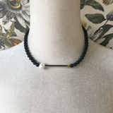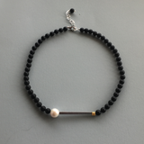 Simple and striking this matt onyx choker length necklace features an 11mm freshwater pearl, sterling silver(925) square tube and mini gold plated 18kt cube.