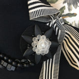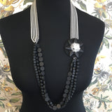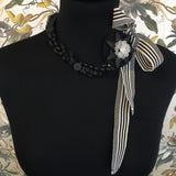 This super chic necklace will make a statement whether you wear it over a t-shirt, knit or evening dress. Be confident and show your personal style with this super Matt Onyx, Quartz, Pearl and Ribbon Necklace. The Ribbon is easy to tie and super comfortable to wear. Handcrafted flower features a hidden pearl.